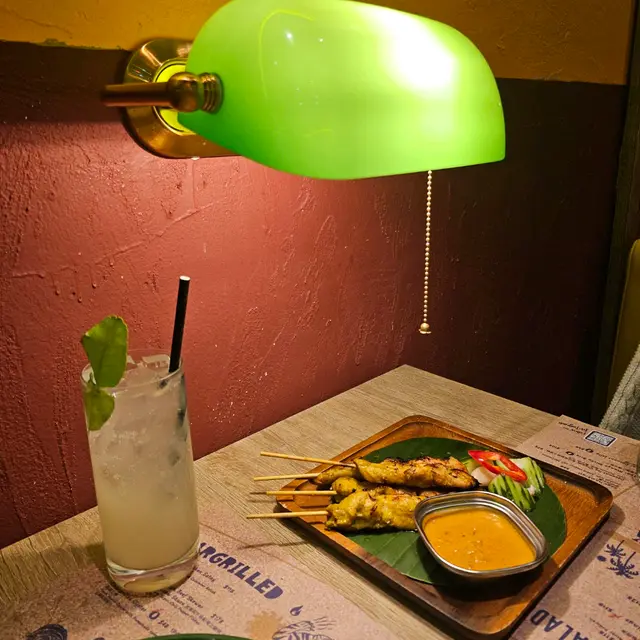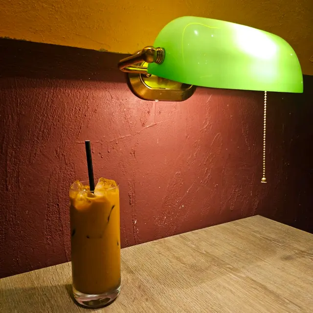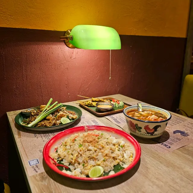 餐廳門面設計搶眼以主色黃色的霓虹燈招牌及酒吧式的復古裝潢,推開門會見到一個大銅鍾,鐘身設有🐘圖案猶如置身博物館似的😁。店內的座位與座位之間都好闊落坐得好舒服。每枱卡位還設有一盞復古的燈,牆身貼上舊式泰國品牌廣告的招紙充滿懷舊色彩。