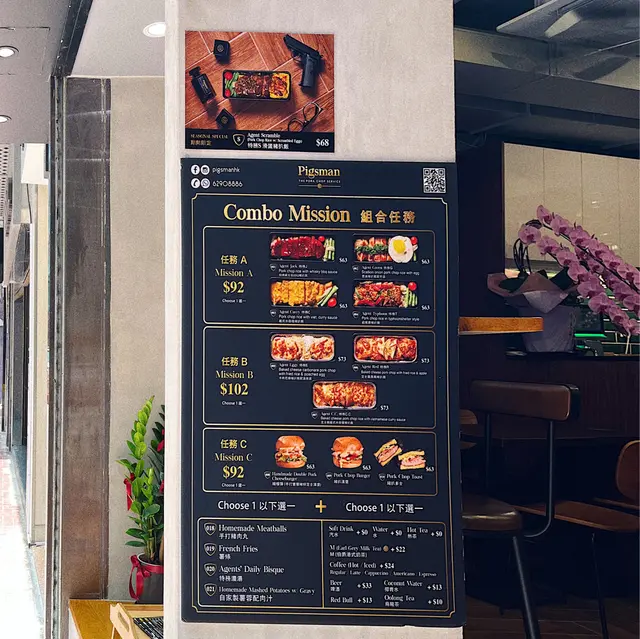 黑金嘅型格裝修,參考Kingsman嘅格局🕵🏻♂️ Pigsman明顯就係致敬電影 金牌特務Kingsman🎬 有睇過呢套戲一定對Agents所擁有嘅高科技武器留下深刻印象👀 攻守兼備嘅遮🌂、帶有神經毒素嘅刀片皮鞋👞、會產生毒素嘅鋼筆🖋️、會電死人戒指💍、打火機形狀嘅手榴彈💣 喺呢到你都會搵到整整齊齊嘅collection🪓 絕對有種置身其中嘅感覺!