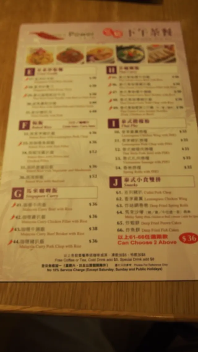看看餐牌,原來到了下午茶時間,與門外的餐牌,便宜不少,當中以東南亞菜為主,如泰國馬拉及新嘉坡等菜式。然而在下對於有辛辣的食物不感興趣,故點選了不辣的食物當午餐。