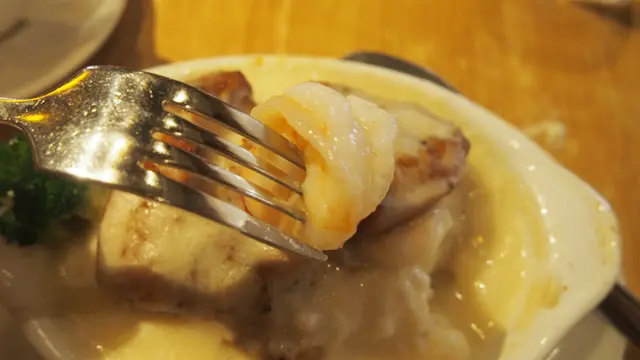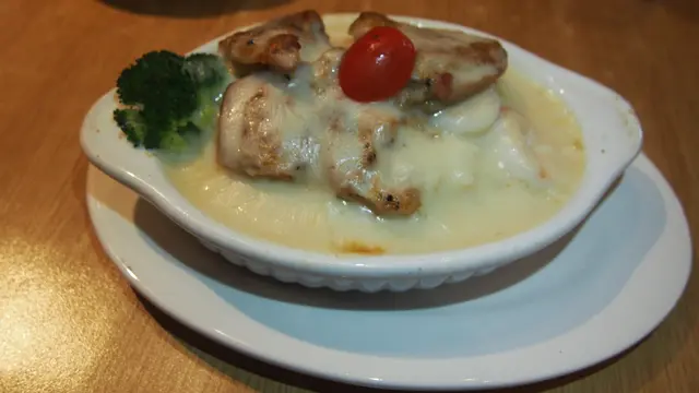 焗蝦球雞扒飯是一個不辣的焗飯,當中的蝦球加上雞扒和一個車厘茄,加上白汁一起焗。蝦仁味道不俗,幾爽口彈牙,雞扒切成四小塊,都幾滑的,而忌廉汁也不錯,整個焗飯也不錯。
