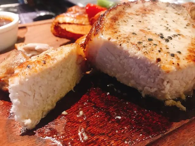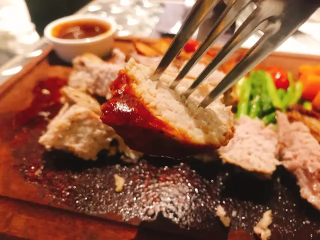 豬鞍扒切開就感受到佢入面嘅 Juicy,肉質夠實在,香燒至金黃色的外層,入面仍然係雪白色嘅肉質,食落好有口感