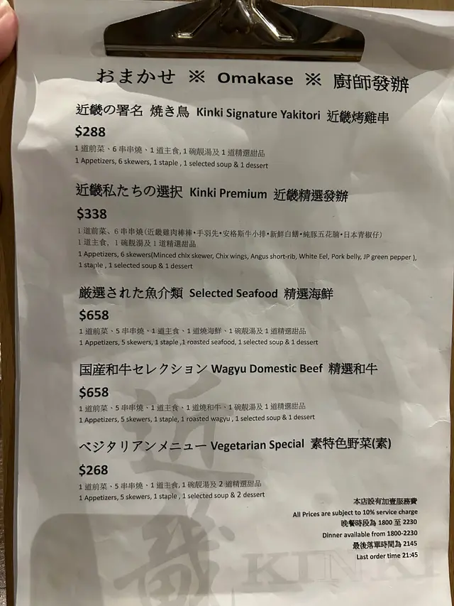 套餐包了1道前菜、6串串燒(近畿雞肉棒棒・手羽先・安格斯牛小排・新鮮白鱔・純豚五花腩・日本青椒仔),串燒每款都好有水準,食材新鮮,調味適中,肉汁豐富,吃得出師傅燒烤的功力。我們還額外預訂了從北海道直送的蟹腳和喜知次,兩款均鮮甜可口,尤其喜知次,魚皮香脆,魚肉嫩滑多汁,油脂均勻,很讚。