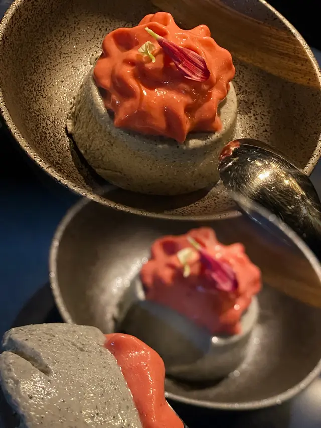 灰黑色布丁上面襯上鮮橙紅色嘅Raspberry foam 顏色對比強烈 酸酸地嘅泡沫同濃滑黑芝麻布丁 味道出奇地夾