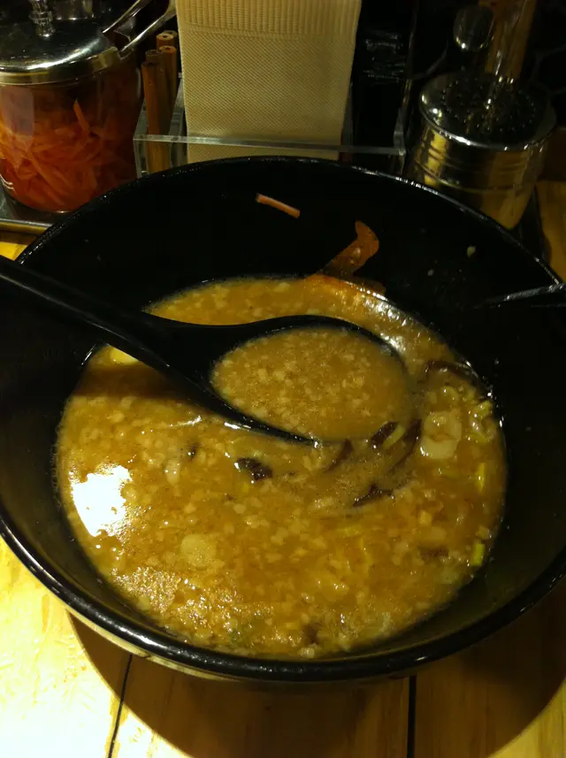 今非昔比,星期五晚7時多,不用排隊,內裏人流都只是小貓三兩隻賣相尚算可以,第一啖把湯喝下- 出事喇!!湯底density奇高,大量脂肪浮面,油膩得令人卻步,有種令人不想繼續吃下去的衝動,失敗!!肉方面,有腩肉/肩肉/豬頸肉,我選擇了肩肉後,看到師父以火鎗烹調肩肉,食客可以看著烹調過程,這地方做得不錯,可惜食落又真係燶左少少……半熟蛋絕對是水準之下,蛋白蛋黃近乎全熟,上檯賣相極差。