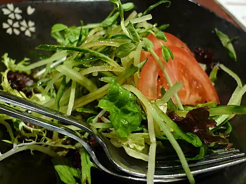 又同舊同事黎荃灣食飯, 本來諗住食和民, 但實在太多人, 又唔比訂位, 所以最後去左石燒. 呢到唔使等位, 一入去就被安排四人卡座, 坐得舒服. 點左個dinner set, 再叫d小食. 先黎個雜菜沙律, 菜好新鮮, 但份量好少