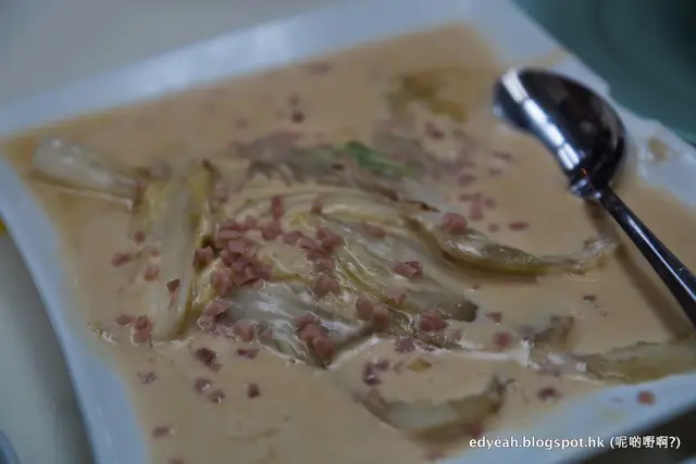 上碟時醬汁滿滿,傳來陣陣疑幻似真的芝士香。一點點火腿粒灑在黃白色醬上,十足芝士煙肉粒,加上青白津菜,有種白色唯美感,是老上海fusion菜。津白已揀好最美部位登場,唯有一兩條帶少少苦。平時點芝士醬多半是薯條Nachos,沒想過米飯也是絕配。奶油軟滑,甜菜掛汁,奉送的白飯已經歷剛剛獅子頭一劫,再遇這道唯有倒下(肚)了。奶味香濃而不覺重口肥胖罪疚感,是肥得來帶點健怡的菜(好似係)。