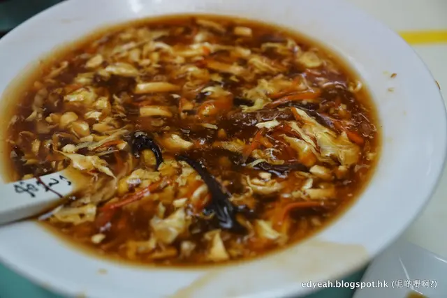 勁大碗勁多料勁香口,市面太多夠酸唔夠辣,反之亦然,但這實在太好味啦!絲絲木耳蘿蔔鮮筍加上蛋花,樣樣獨有其味,由軟到爽也細嚐,襯上淡黑的黏口湯羹,是味覺視覺的多重享受。飲完又裝,裝完又飲,呢碗嘢盛到六至八碗仔,一止酸辣癮。