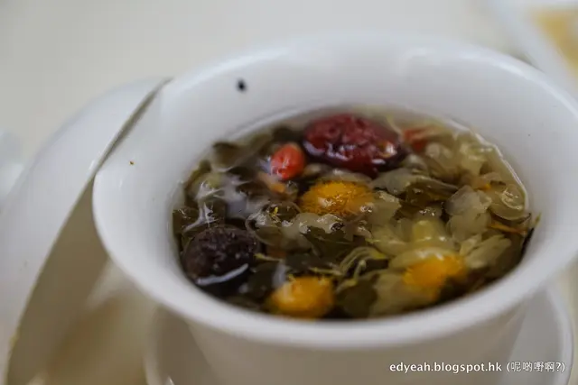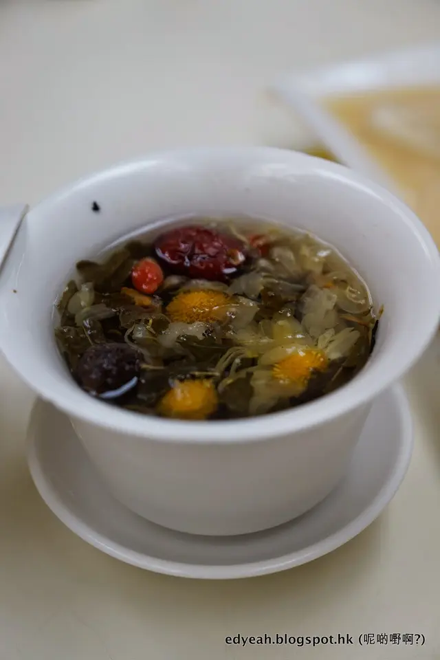 數得出上一次飲一盅盅的茶是何時嗎?飽頓後喝茶,是何等樂事,爽哉!揭起盅蓋露半香,榮華八寶盡溢上。這兒的八寶茶不算正宗,但非常足料,紅棗杞子菊花果皮蜜棗等等唔打得都睇得嘅藥材沖上香片,未飲已聞其香。啖啖帶甜的茶,勁正氣,又消濟。