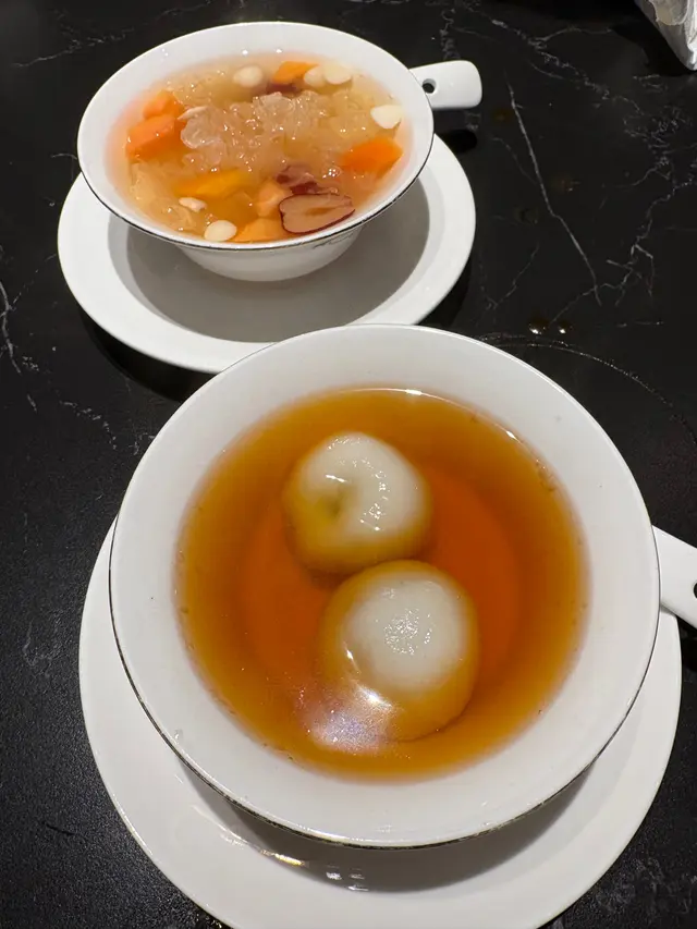 主食的「點心拼盤」精緻多樣,包括佢哋招牌嘅流奶包。甜品可自選我哋揀咗薑汁湯圓同木瓜燉雪耳,兩者都好好食,為整餐畫上美好句點。