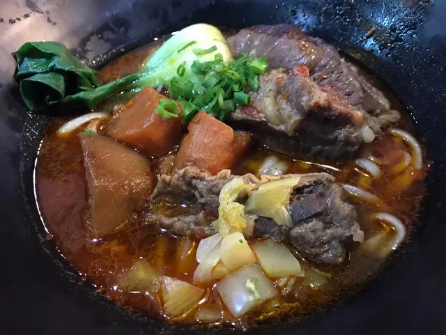 紅燒牛肉麵湯底有點辣,麵條較腍;牛肉煮得頗入味,可惜口感有點韌。
