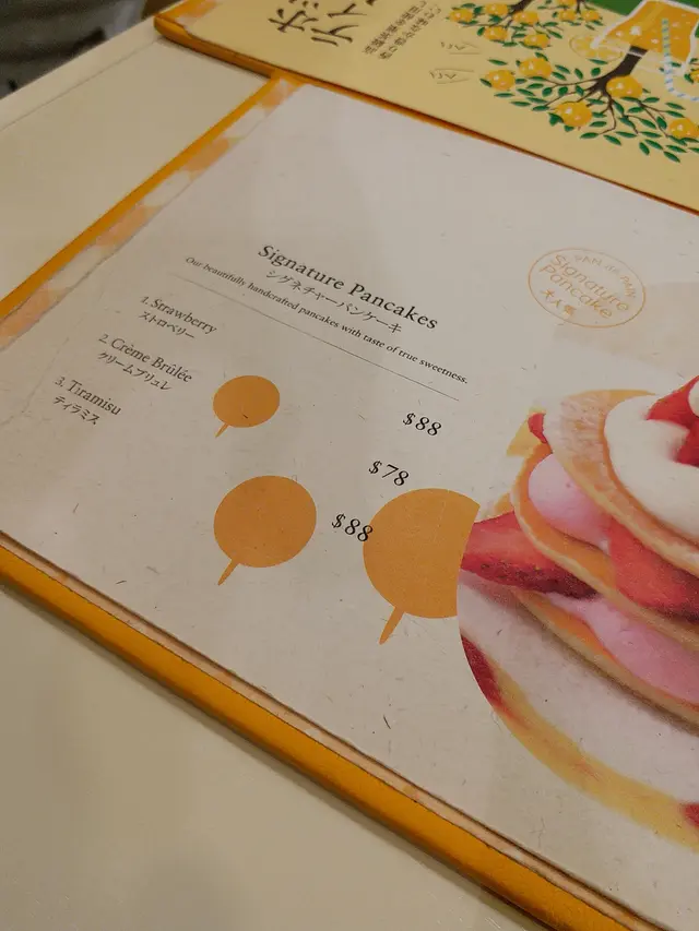 餐牌推薦項目: Signature Pancakes, 第一項: Strawberry ($88), 下午茶, 吹水時段, 大家各自一杯飲品, 甜點...一件就夠了.