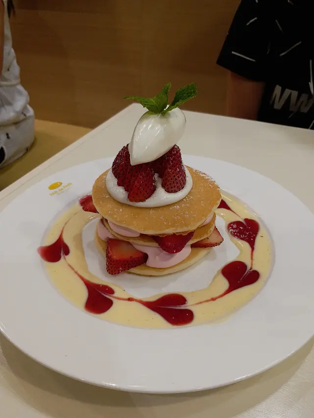 等了十多分鐘, 甜品上檯, 心情當堂平伏了許多...., 賣相真係正喎, 呢D就真係目到個樣就想食啦, 士多啤梨的口感十分好, 但味道唔算十分香和新鮮, 甚麼是香和新鮮?? 你去Citysuper 買盒國泰航空包裝的日本士多啤梨, 就會知啦..., Pan Cake也軟熟, 但只是麥記水準, 做得最好的是夾在中間的Cream, 的確比Italian Tomato 的cream, 更軟滑.