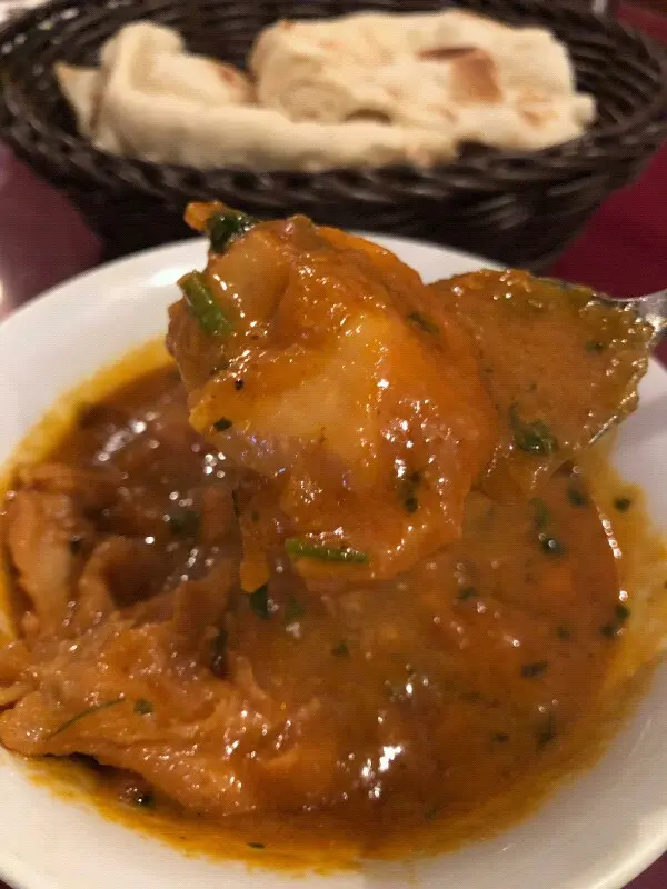 我個人更愛雞肉拼瑪沙拉,炆得鬆軟的雞肉混合瑪沙拉一起吃,可口味美,每吃一口都令人讚嘆,再用烤餅點著咖哩汁吃,真是享受,一會兒烤餅和咖哩汁都比我們吃清光了。