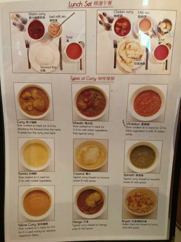 餐牌上有好多唔同種類的咖哩,而大部分每款咖喱都可以配雞、豬、羊、牛或海鮮。每款咖喱都有其特別的味道,有時間可以慢慢每款都試下。
