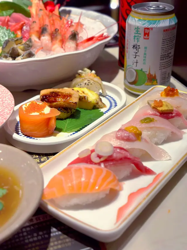 刺身種類幾多,厚切鮮甜,基本上都冇伏!大推佢嘅三文魚、油甘魚、藍鰭吞拿魚、帶子同甜蝦,超鮮甜!三文魚、油甘魚、藍鰭吞拿魚油脂豐富,食落甘甜,黏糯嘅口感好正!除咗刺身,仲有多款壽司同手卷,推薦芝士鰻魚玉子燒、海膽手卷、紅酒藍莓鵝肝🍣!