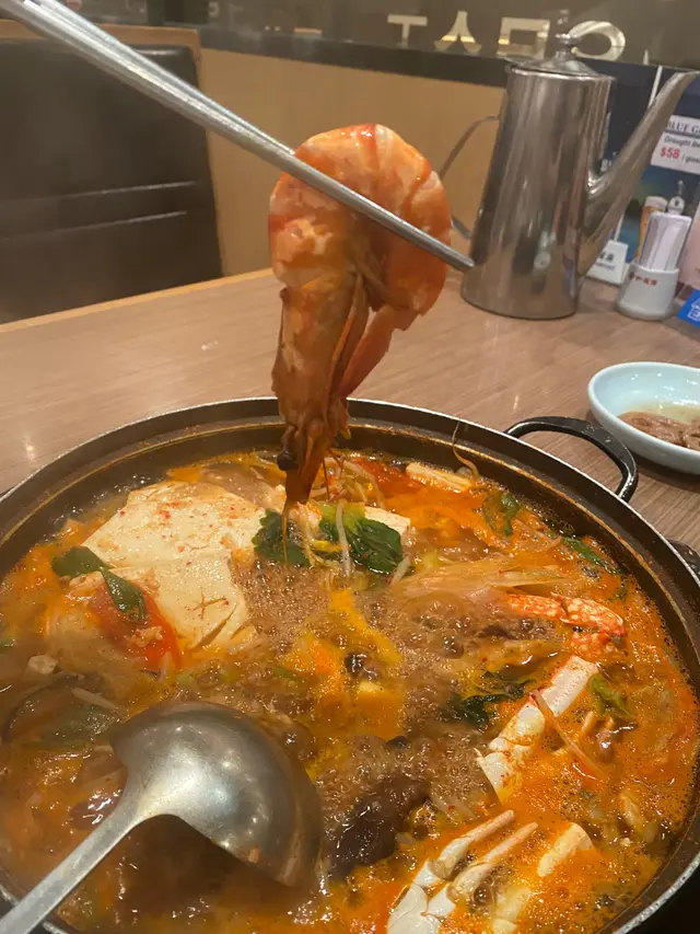 🦀除左海鮮外,仲有好大磚豆腐,脆玉瓜、蘿蔔、金菇、菜。湯底係泡菜湯,好濃味,d菜同豆腐入晒味好正!勁滿足😋