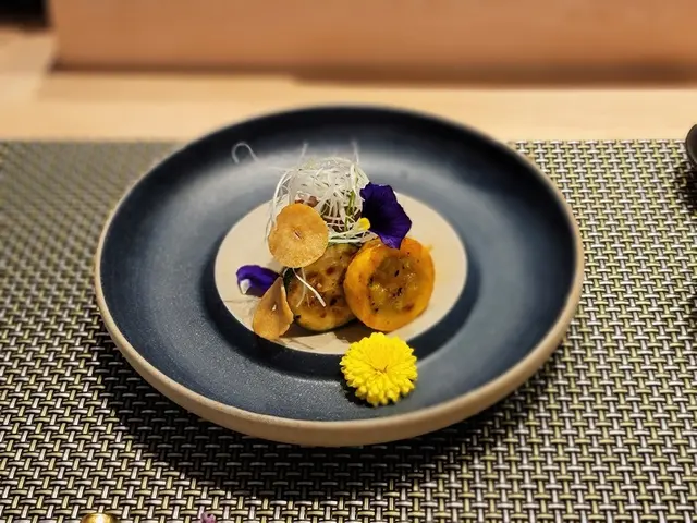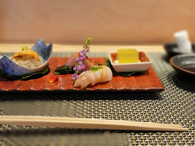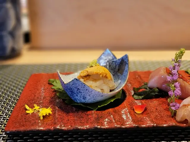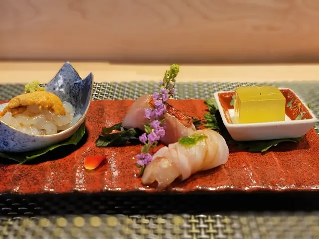 這款菜餚從左方開始分別是富山灣白蝦,其頂部配搭有馬糞海膽、山葵同食,口感鮮甜即化,爽滑微辛。