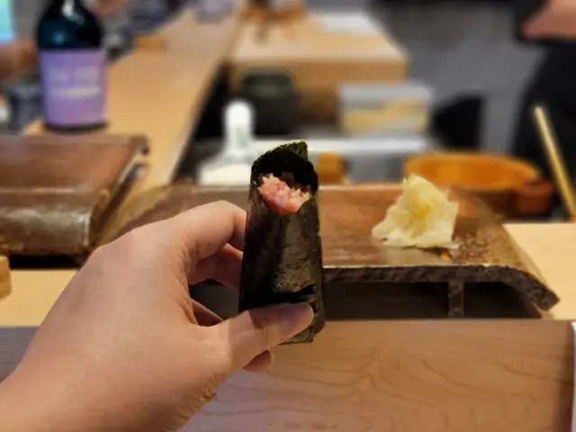 選用紫菜包裹上吞拿魚蓉,以防止散落方便食用,口感幼細香滑,軟綿油香,鮮甜即化。