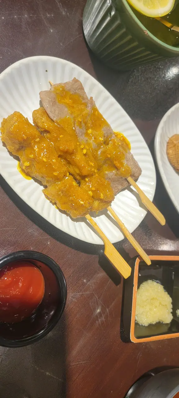 其次小食素牛肉同雞肉串燒配沙嗲醬,