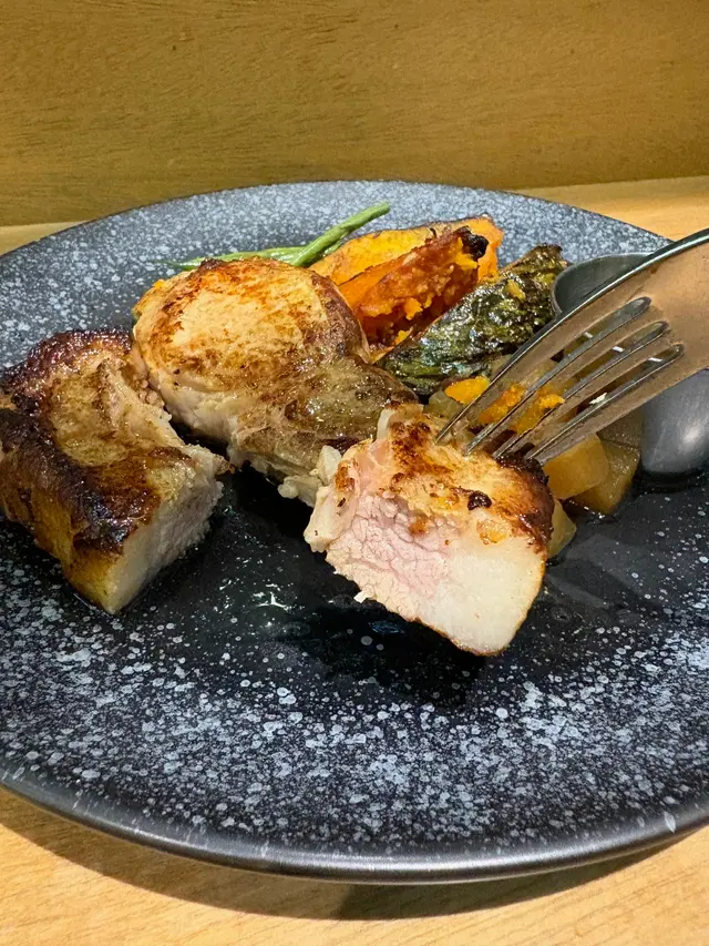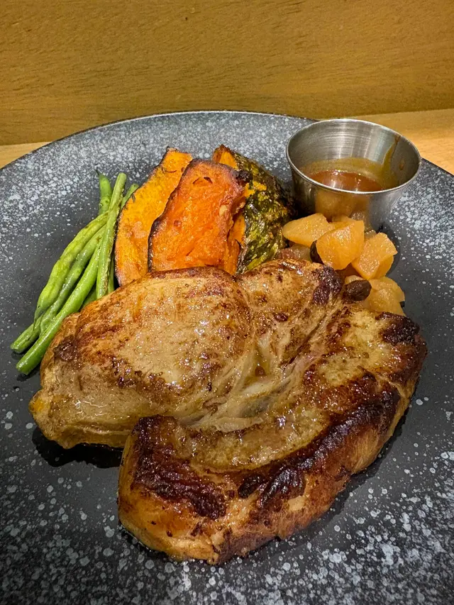 這道主菜顏色吸引,營養又豐富,味道也很好。厚切日本豚肉的脂肪比例平均,肉質內軟、香滑多汁,搭配肉桂蘋果粒、提子乾和粉糯烤南瓜既香甜又飽足,還有清脆法邊豆,是一道色香味俱全的主菜。