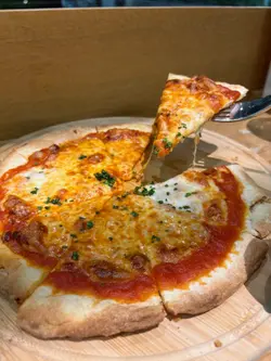 用上水牛芝士、貢佐拉芝士、芳提娜芝士、埃文達芝士、車打芝士、巴馬臣芝士和番茄醬,薄脆餅底,再沾上蜜糖,不膩又美味。