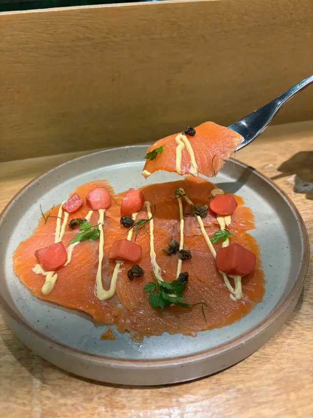 前菜:煙三文魚薄切`醃小蘿蔔`香橙忌廉汁