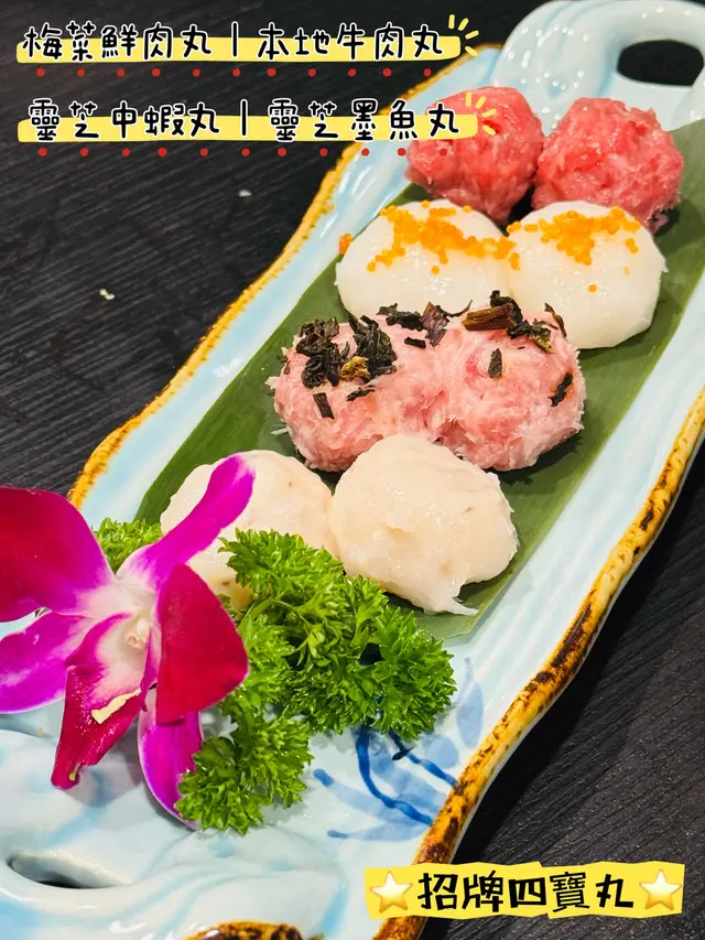 四款都係店家嘅招牌手打丸,梅菜肉丸味道清爽,牛肉丸爽口牛味濃,蝦丸鮮味十足,墨魚丸QQ彈彈仲食得出墨魚粒嘅口感,後兩者仲加入咗靈芝特別矜貴