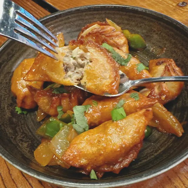 見到招牌就要試試,Sauce係彩椒洋蔥甜辣撈汁,第一次食撈餃,煎餃再「索」滿醬汁超入味,每隻餃子都包入滿滿雞肉,價錢好抵食!