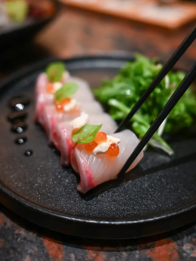 [煙燻平政壽司 & 刺身]煙燻平政雙重演繹,鰤魚平政肉質肥嫩,醬油忌廉添層次而不搶戲。