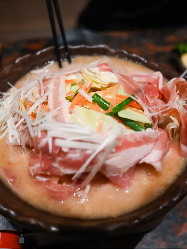 [銀鱈魚酒粕燒]外焦內嫩,[五日市豚肉鍋]以甘酒提鮮,滿滿的蔬菜菇菌,暖胃又不過甜。