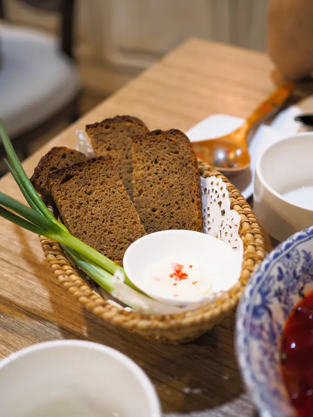 首先上枱嘅係麵包,口感同味道都同平時嘅唔同,原來係黑麥酸種麵包。食落麥味濃,帶點微酸,口感比一般麵包實,搽豬油食幾特別。