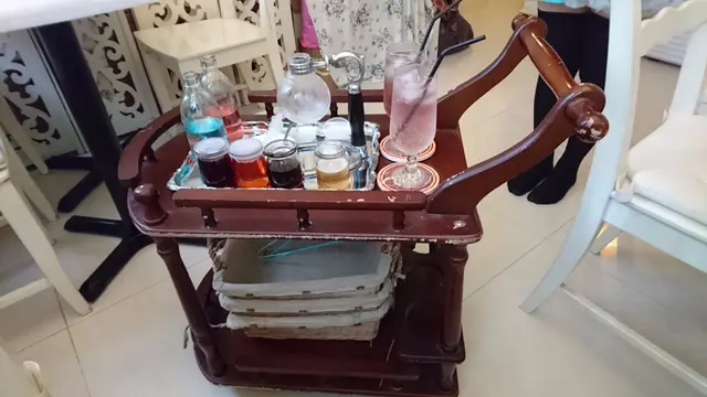 首先女僕推左架車仔,係我地面前施魔法製做氣泡魔法水,見到d瓶都好得意好特別,同埋d顏色好靚,女僕叫我地選喜歡既顏色,攪好後,送上我們面前,再施魔法,之後更叫我們跟著她一起念咒語施魔法,我第一次當然覺得好尶尬,所以都冇馬上跟著做,至於我友人,佢經驗豐富,日本、台灣、香港的去過不少,但呢一刻,佢同我一樣,你眼望我眼,我地又望住個女僕,後來,女僕鼓勵我地跟住一齊施魔法,最後我地都有跟住做,因為"費時"要女僕難做,而且又冇其他客人係度,所以ok la~~人生點都要有一次既