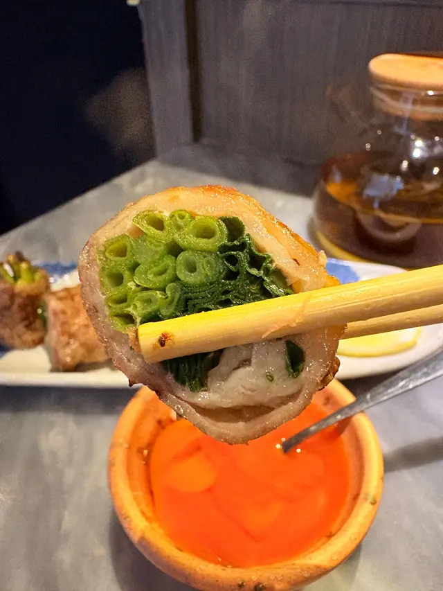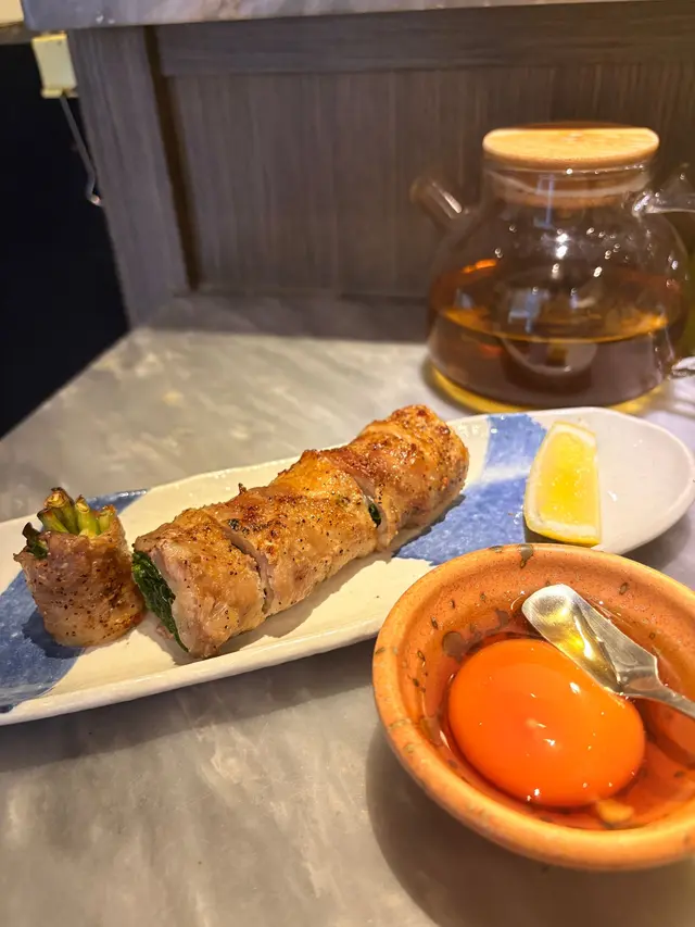北海道豚腩肉包裹蔥卷,豬肉肉汁充滿口腔,蔥香脆多汁,配搭完美。蘸上生雞蛋的日式醬汁更添濃郁,好治癒!