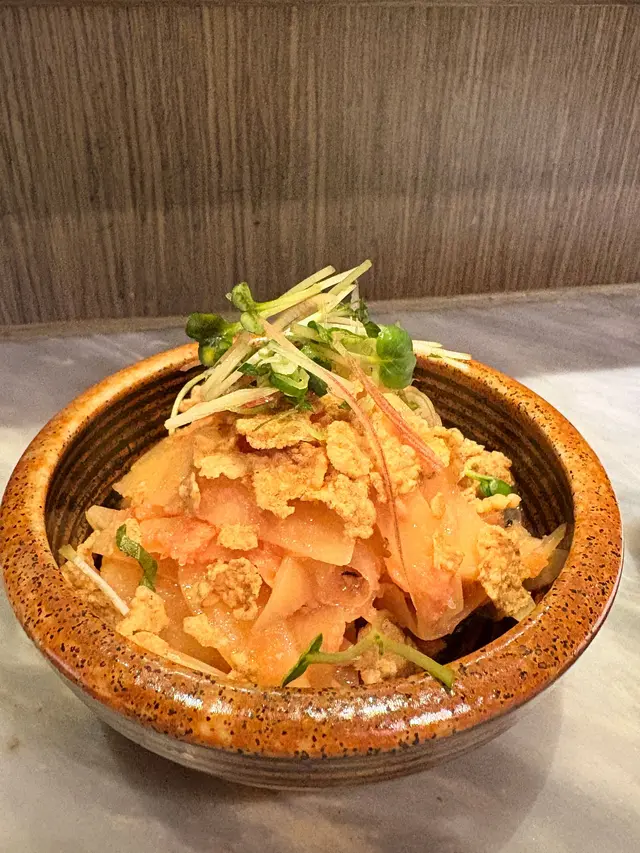 薯仔切片帶爽脆口感,配上鹹香明太子和帶點酸甜的椒麻油,味道清新開胃。