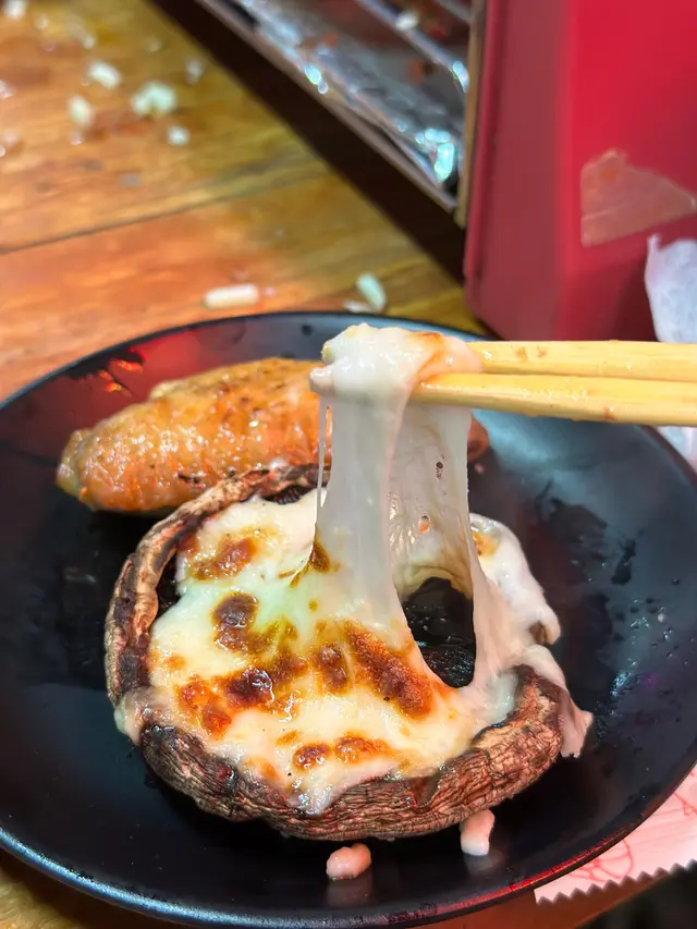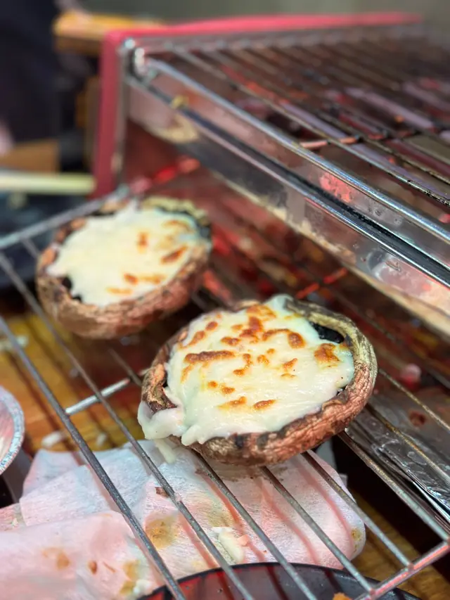 個燒烤爐有兩層,喺上面燒緊海鮮嘅時候可以喺下層燒吓薄啲嘅肉同菜,我地仲善用咗下層嘅優勢,整咗芝士大啡菇😍😍😍 係拉絲嘅芝士😍😍😍 雞翼怪當然要燒嚟試吓~ 都醃得好入味🤤