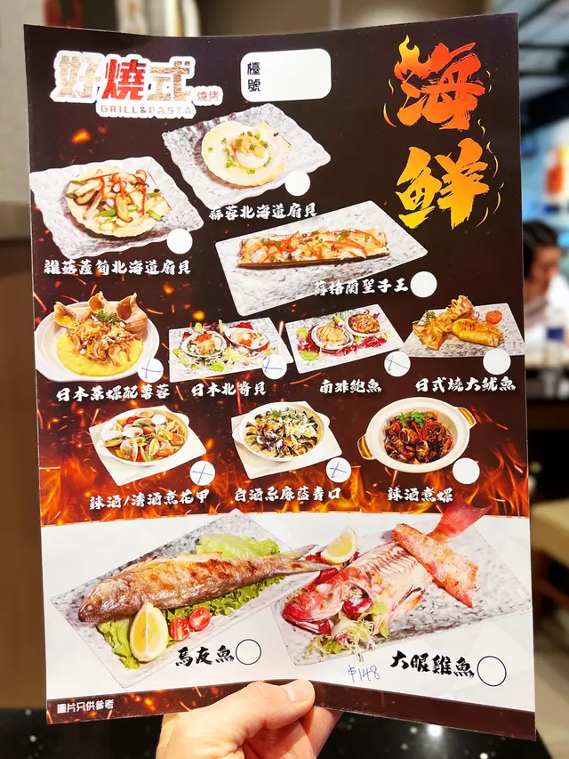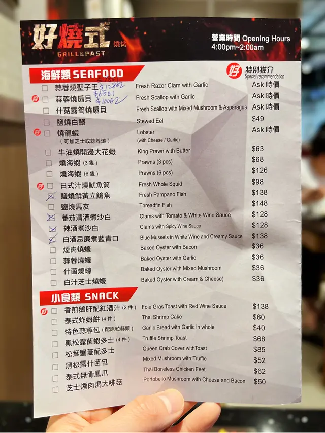 菜式方面選擇非常之多,有海鮮、肉類、小食、意粉及廚師推介等等。串燒可選辣度由走辣至大辣,調味亦有蜜糖、孜然粉、辣粉、麻辣汁和泰式酸辣汁。