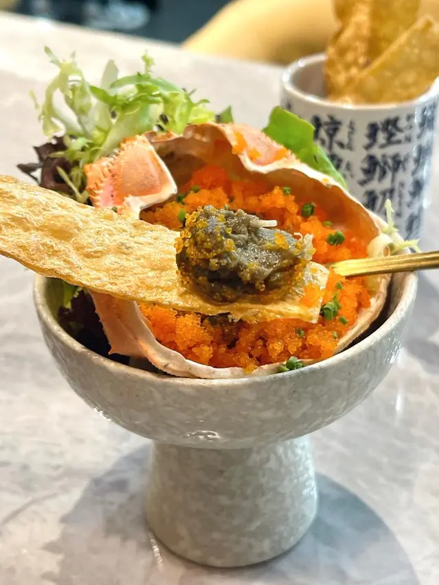 蟹膏甲羅燒: 蟹膏為常溫, 加入了大量蟹籽, 配上脆片, 伴上蟹膏入口, 平衡到濃郁嘅鹹香鮮味, 而蟹籽令口感更為豐富有層次。