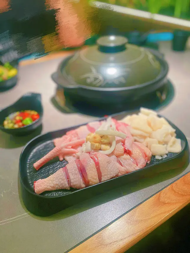 雞肉果然係招牌菜,肉質十分鮮嫩,搭配特製蘸料,口感層次豐富,醬料每人$16,自助台有多種選擇,估唔到有埋原粒小金桔🍊湯底鮮美,清甜唔膩,性價比高👍🏻 竹笙好似海綿咁吸晒湯底,淡淡鮮味