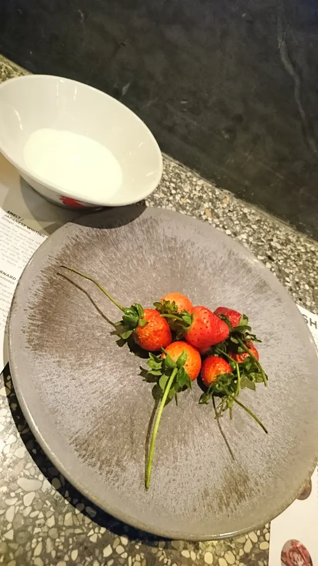 2.0 Local Organic Strawberries 話明係有機即係細粒又醜樣都好正常啦! 士多啤梨香氣不足, 果肉內係白色一片那種(好似日本佐賀縣那種), 唔夠甜就意料中事了, 所以那打至7分起的忌廉在這環節上很重要! 講真唔好話同日本士多啤梨比, 即使用馬莎嘅埃及士多啤梨都好食過呢隻好多! 只不過呢度主持人堅持用本土野咁啫, 不過如果係咁, 既然來貨是改變不了但又點解唔諗下計將這其貌不揚的東西改頭換面一下, 不要這樣赤裸裸地放在客人面前呢? IDEA總會有的吧! 而這道生菓甜品的碟又怎樣呢?用深灰色大碟上ok! 問題不大但怎麼裝忌廉的盛器會是隻白瓷公雞碗?? 我只感覺是隨手拈來的一隻碗就用上了!