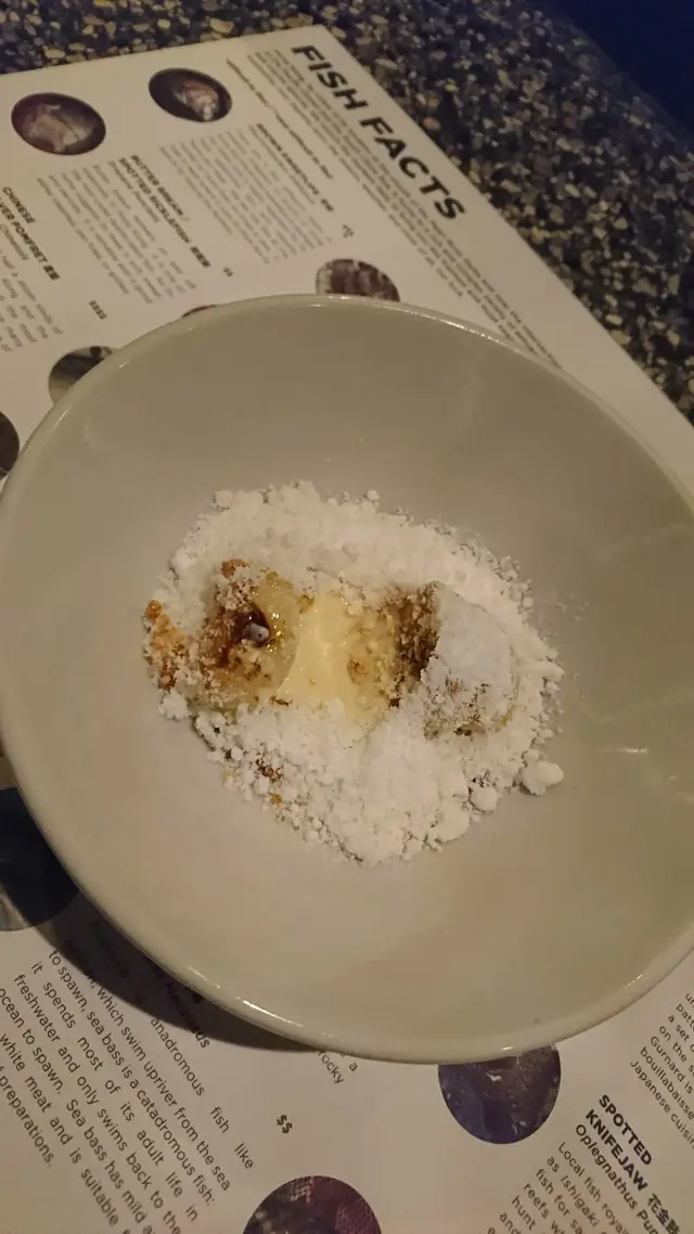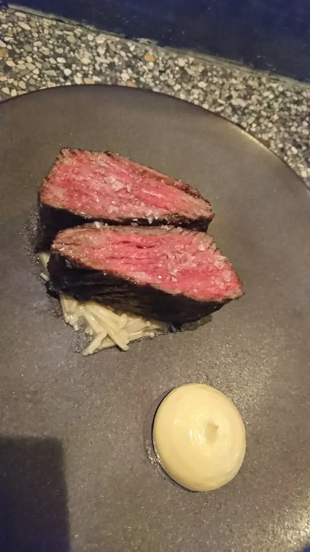 1.7 Wagyu Bavette steak / Salted Fish Aiolio 和牛腹肉厚切兩件, 下面放了些金菇菜, 旁邊只唧了一圓形銀魚做的蛋黃醬, 牛腹肉脂肪少但完全不嚡重好淋滑, 不過個銀魚醬就太咸了可能用多了銀魚的份量! 而當日在我們吧位枱旁邊另外座咗兩個年青人, 其中一個就頂唔順呢個咁濃同咁咸嘅Aiolio了, 叫廚師俾過另一個普通d嘅汁俾佢伴食,