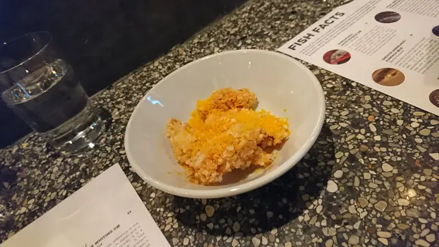 1.6 Threadfin / Anchovies / Sardine 卒之有多一個較為有溫度的食物端上來, 烤沙丁魚柳兩件, 上面放了些義大利銀魚同包屑的混合物, 魚柳沒烤過頭, 魚肉質地很正路. 只是面的銀魚茸有點咸, 同時上這魚用的碟顏色太深突出不到兩件魚柳, 背後的深啡色同前面魚柳的淺黃色沒有對比, 只靠那一點點綠色無法令魚件跳脫出框框,