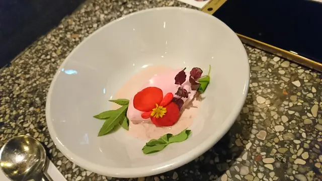1.8 Flower Sorbet 顏色呈攻紅與粉紅之間的雪葩是用本地紫背天葵花做成, 雪葩又非全是冰粒內裡混合了好些乳酪忌廉類, 所以口感在雪糕與雪葩之間吧! 而食用嘅花主要是帶給雪葩一個酸度亦可有裝飾效果, 一石二鳥!