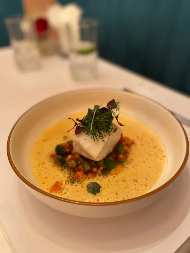 2.鱈魚柳配貝類辣肉腸泡沫,同樣地這個魚柳比較清淡煮出來肉身也很林嫩滑,配襯的醬汁也很好吃