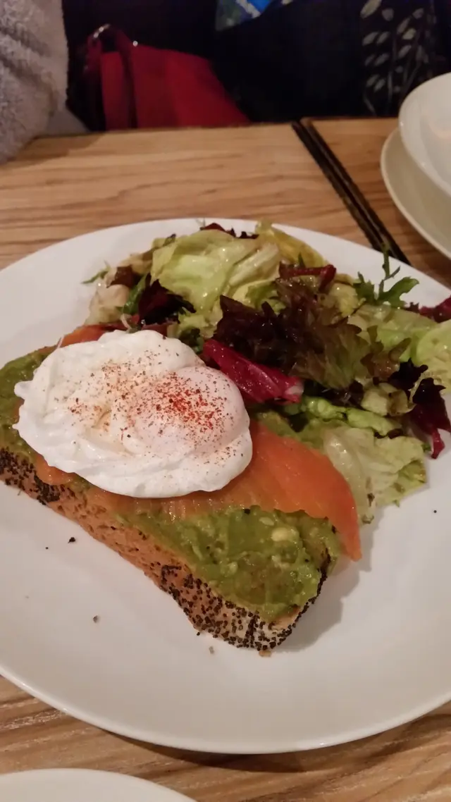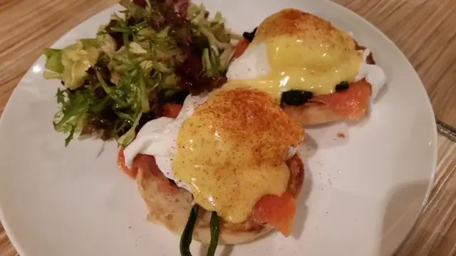 最最最期待的egg benedict率先登場!賣相的確討好,如果hollandaise sauce多一點就更好了! 爽口的沙律配上微酸的黑醋無疑令人食慾大增。好了,是要品嘗主角的時候了。輕輕切開poached egg,美味的蛋漿比預期的少,更重要的是,旁邊的蛋白也不夠滑呢! hollandaise sauce 與蛋漿本應是絕配,但分量不足令期待的egg benedict扣了不少分數。