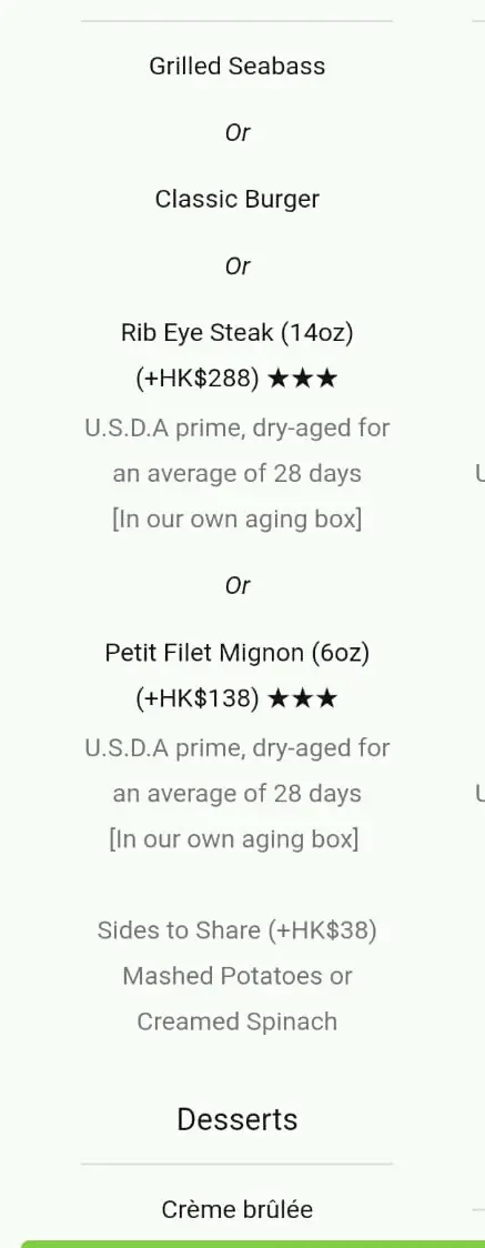 只隔數月已分別很大!失望! 惜食識食等级32019-08-282K 浏览 关注 又是Restaurant Week美食週,因上次來Wolfgang 有一個非常好亦值5星的體驗,所以今次特別推介給朋友再次光顧。但、但、但就好像去了另一間扒房一樣,什麼也不是我數月前來的Wolfgang.有什麼改變?!無論是食物烹調質數或是food presentation, 什至服務員的態度也差了很多很多。有兩個女服務員根本就不願招待客人一樣!叫她take order不理會只用手勢敷衍我們、另一位送餐擺放客人前時根本不對客人所叫的安排,放餐在枱上時竟然用身推到客人坐著的坐位也不會說聲“不好意思”,很沒禮貌!我上次食評特別讚的服務專業今次全失,感慨!不打算每個菜式評論,味道不過不失。 Restaurant Week lunch menu Main choice如下:11以上食记乃用户个人意见 , 并不代表OpenRice之观点。赞好分享只隔數月已分別很大!失望! Wolfgang's Steakhouse Hong Kong https://s.openrice.com/QrLT0XROr00检举 张贴 评分3味道4环境1服务3卫生3抵食用餐途径堂食