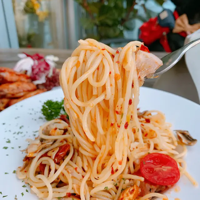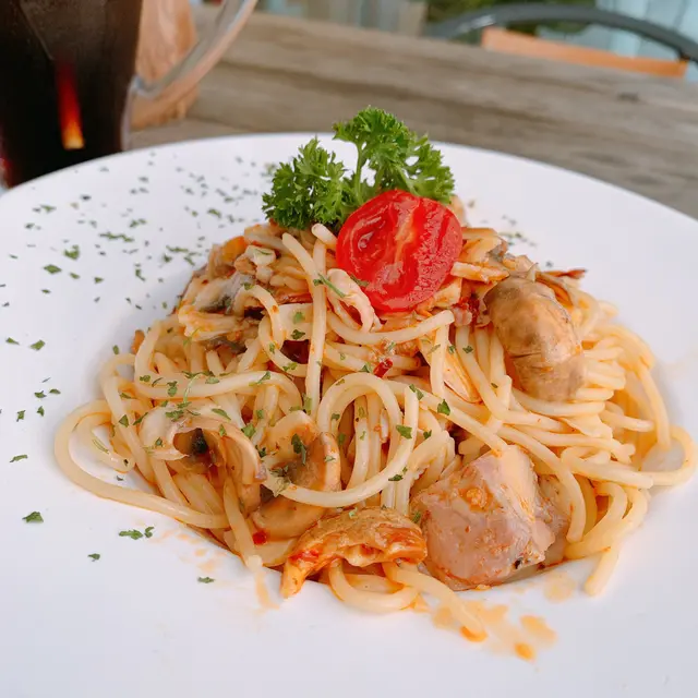 蒜辣雞肉白菌意粉,這款意粉想不到原來都幾辣,很適合喜歡吃辣的朋友!意粉帶有蒜片的香味,辣味非常濃郁,非刺激味蕾!拌入了雞肉和蘑菇,口感豐富!