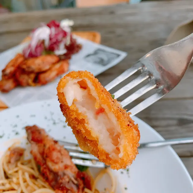 全日早餐,這裡的all day breakfast 有芝士炒蛋、迷你沙律、法蘭克福腸、煙肉、牛角包、忌廉蟹肉薯餅、煙三文魚!炒蛋都幾嫩滑,忌廉蟹肉薯餅食落好creamy的感覺,幾惹味!法蘭克福腸已切好一片片,基本上都不需要再用上刀了,大人細路都岩食!