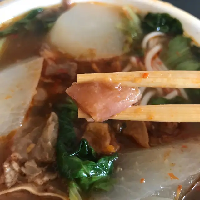 呢度設有最低消費每碗$28,我叫左汁煮蘿蔔($7)、生菜($7)同牛筋牛腩($11),再加埋個米線($8),三餸米線總數係$33,價錢都合理,另外有辣菜脯同埋有幾款汁揀,有咖哩汁、沙爹汁、腩汁同秘制辣汁,鐘意食辣既我當然要試辣菜脯同埋秘制辣汁(小辣)啦! 落完單俾完錢就可以企一邊等,我一路睇住姐姐整,見姐姐夾餸都幾手緊下,喺等候期間我竟然見到有烏蠅喺啲餸上面飛飛下,衛生方面確實要改善下,例如搵蓋蓋住會好啲。