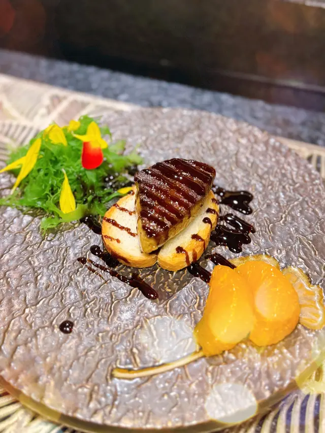 唔同出邊食嘅鵝肝薄薄一片 呢度嘅鵝肝足足有兩至三隻手指厚 令到佢可以做到外脆內軟 咬落去焦香嘅表面配搭軟綿綿嘅口感 油脂在喺口入邊蔓延開去