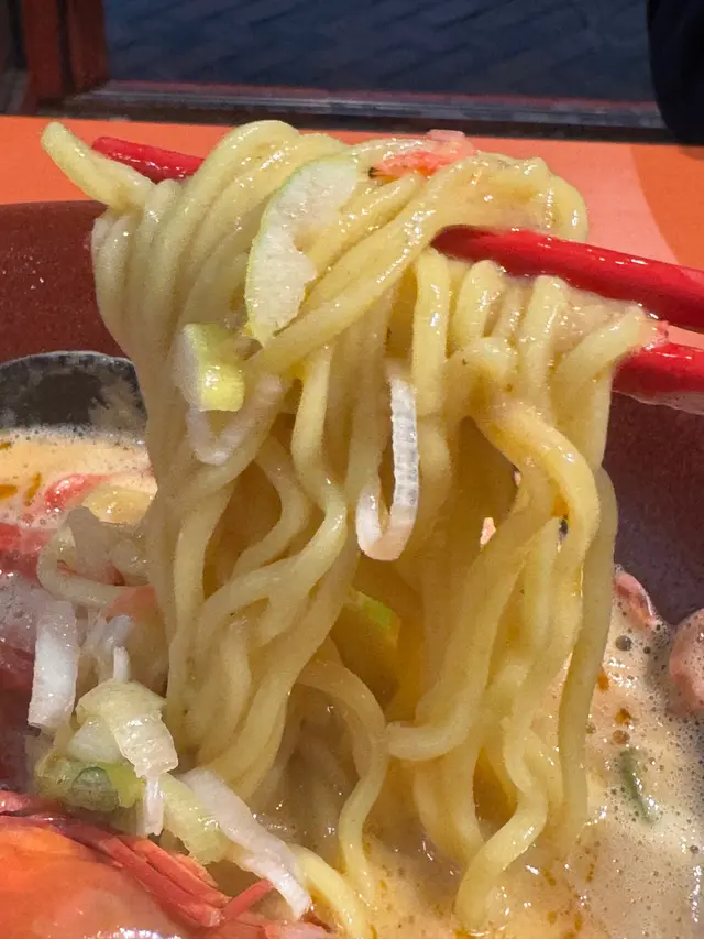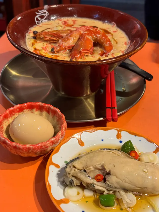 老實説,我是透過衛詩雅的 YT channel得知這家蝦拉麵的,因此特意今天來試試。到了現場需要排隊十多人,原本以為至少要等上四十分鐘,沒想到十分鐘就進去了(因為我一個人😁#一个人会上瘾[话题]# )。坐下後選擇了約五分鐘就有食物上來。在用餐前,會在你面前淋上蝦油,以增強色香味。首先品嚐湯,味道濃郁的蝦味,櫻花蝦的加入也增強了蝦的風味,真是不錯。麵條與湯的結合非常佳,碗中有三隻蝦,蝦肉實在可口,但肯定比不上白灼蝦那樣的彈性。我還加了隻蛋和蠔,如果蛋再糖心一些會更美味,蠔也相當大隻,是冷盤,如果即叫即煮熱食的話,感覺會更好。最後,老闆非常好,會提供杯酒給排隊的顧客。我在入座後開口詢問,他也很熱情地給了我一杯清酒🍶👍。